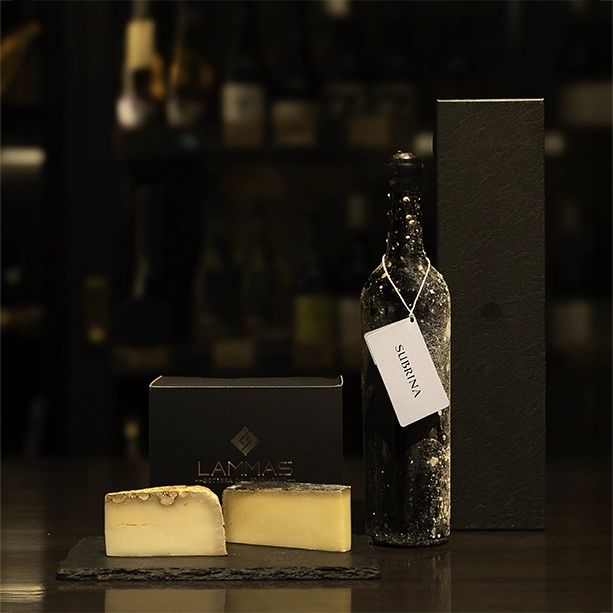 SUBRINAは海底熟成により、タンニンや酸味の力強さは柔らかく丸みを帯びています。逆にフレッシュな果実味は十分に残っており、そんな海底熟成ならではの特徴を引き立てるチーズとのマリアージュをセレクトしました。ワインの丸いタンニンにはサン・ロマンの産地特有な旨みを。酸味にはMONS熟成らしい上品さを。フレッシュな果実味にはこのチーズの名前の由来でもある、ガメイ・サン・ロマン種のワインでウォッシュしたフルーティーなニュアンスを合わせました。是非サン・ロマンは少し厚めにカットし、常温に戻しお愉しみください。 二人の感性と経験が重なり、SUBRINAワインとLAMMASのチーズは、互いの魅力を引き立て合うペアリングとして仕上がりました。ワインと2種のチーズは、それぞれギフトボックスに入れてお届けします。贈り物としてはもちろん、華やかなパーティーのひとときにも、ご自身へのご褒美としてもおすすめです。食後の語らいの時間に、ぜひゆっくりとお愉しみください。 ==============================