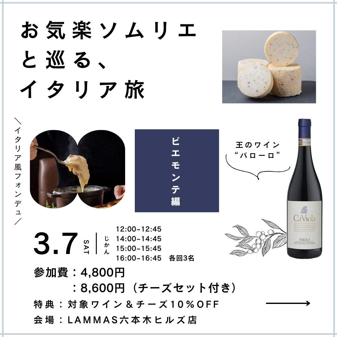 《六本木ヒルズ店》3/7(土)お気楽ソムリエと巡る、イタリア旅 〜ピエモンテ編〜 [G0003]