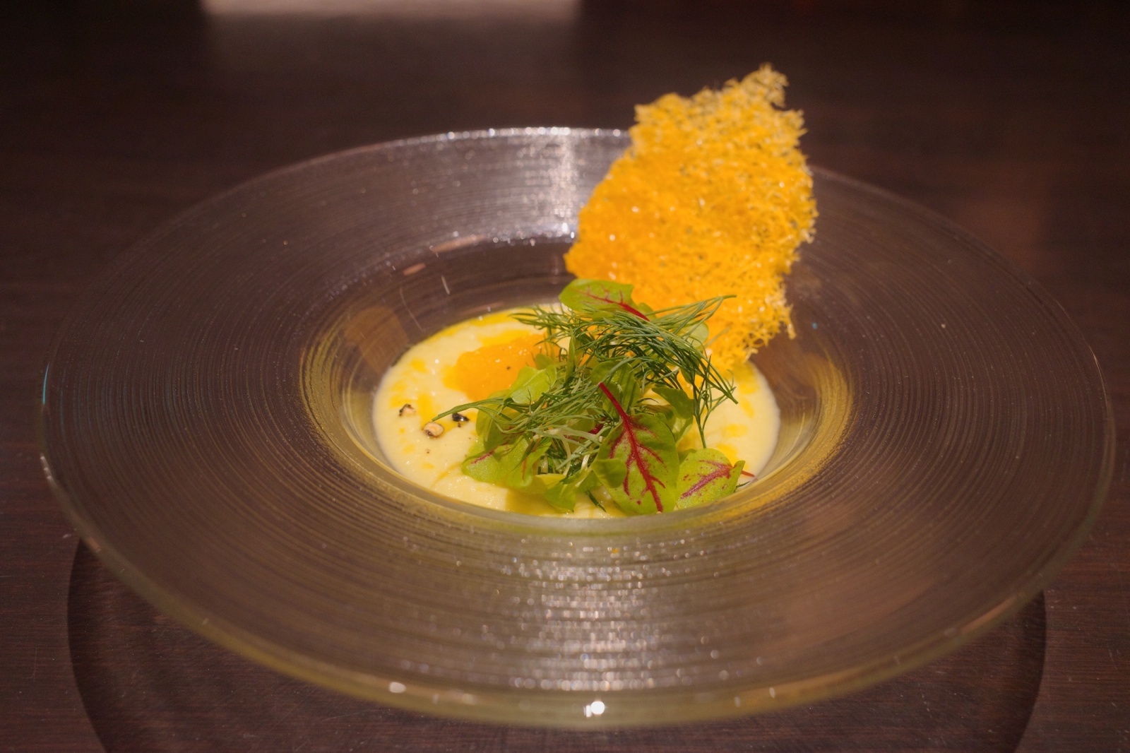 ・春キャベツの冷製スープ パヴェ・ド・コルベールのチュイルと柑橘